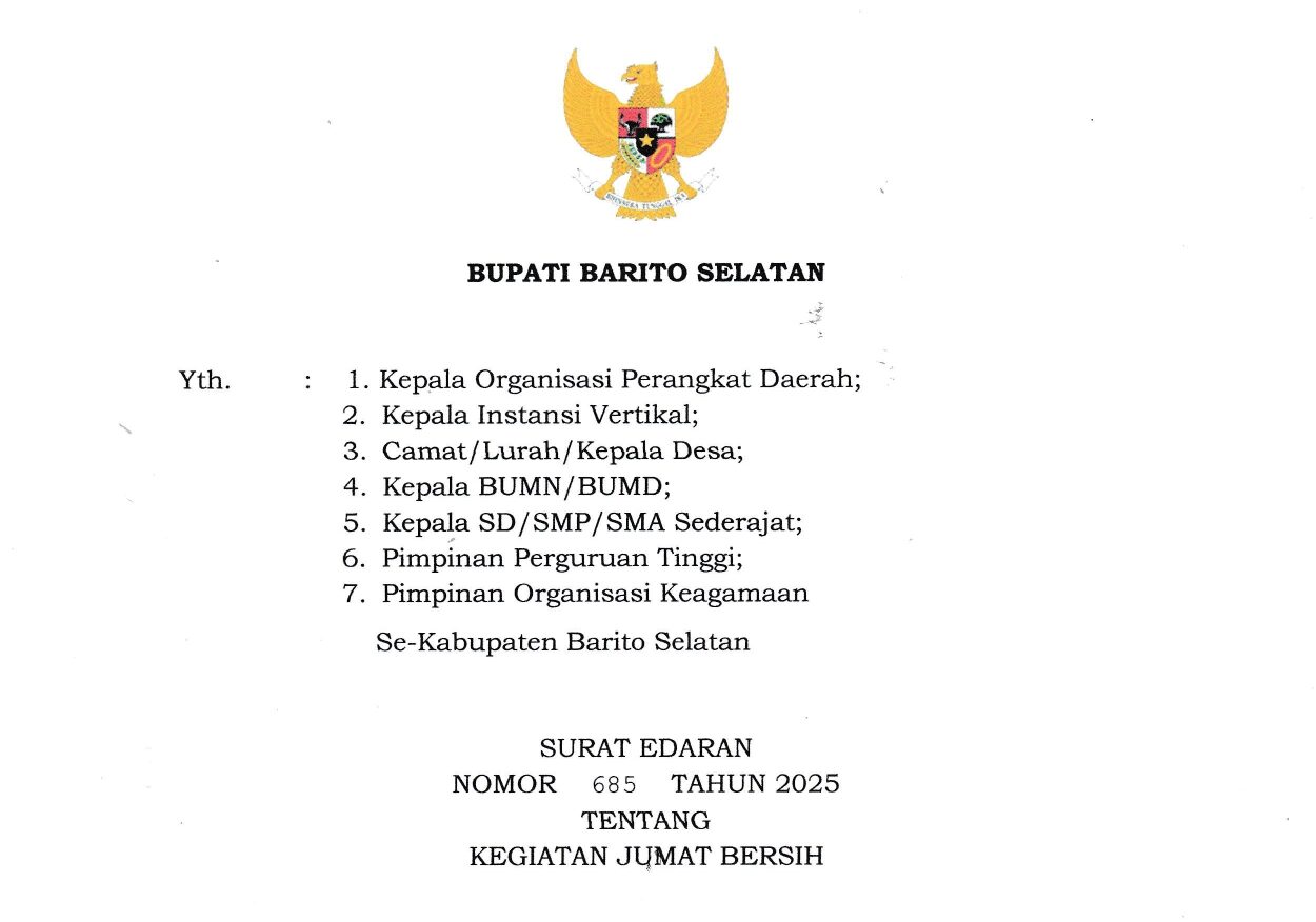 Dalam rangka menciptakan kebersihan lingkungan, meningkatkan kepedulian dan kesadaran masyarakat dalam upaya pengurangan dan penanganan sampah serta melestarikan budaya gotong royong di Kabupaten Barito Selatan, Bupati Barito Selatan mengeluarkan Surat Edaran Nomor 685 tahun 2025 tentang Kegiatan jum’at Bersih.