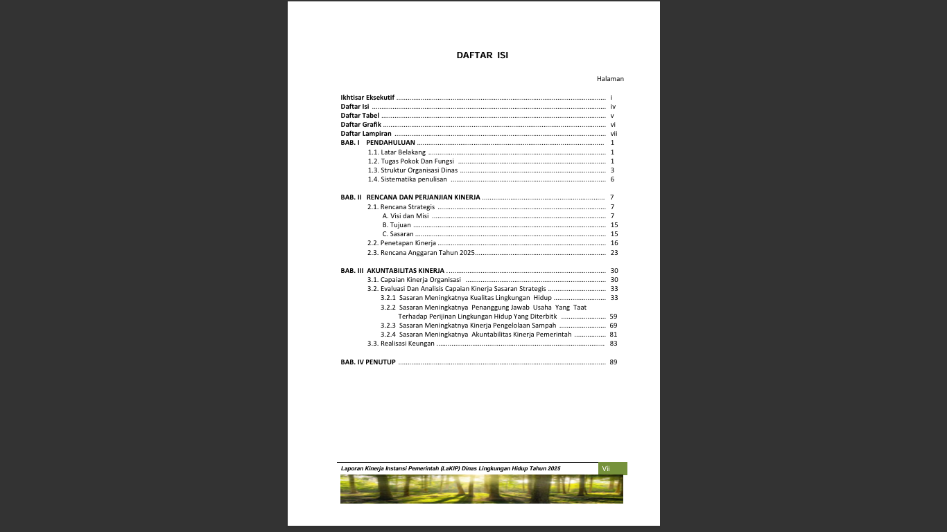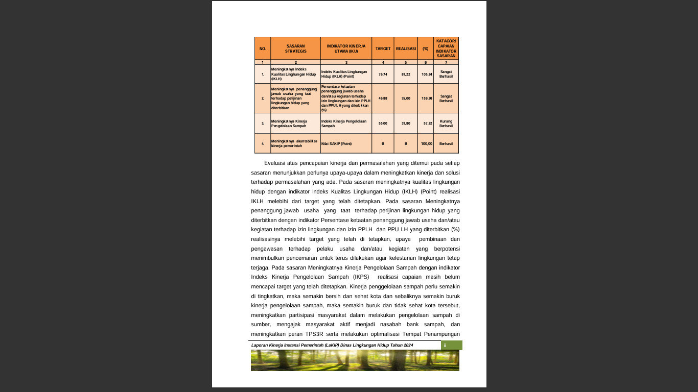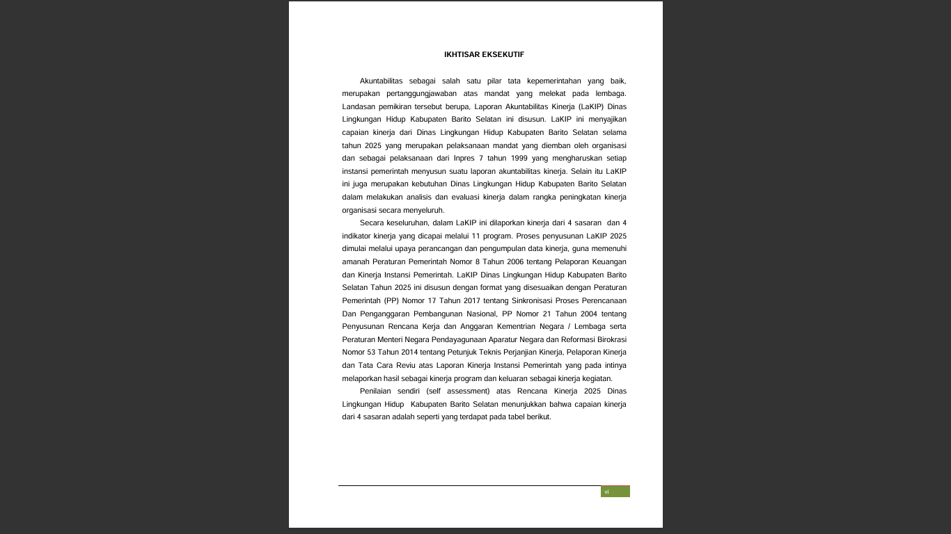 Akuntabilitas sebagai salah satu pilar tata kepemerintahan yang baik, merupakan pertanggungjawaban atas mandat yang melekat pada lembaga. Landasan pemikiran tersebut berupa, Laporan Akuntabilitas Kinerja (LaKIP) Dinas Lingkungan Hidup Kabupaten Barito Selatan ini disusun. LaKIP ini menyajikan capaian kinerja dari Dinas Lingkungan Hidup Kabupaten Barito Selatan selama tahun 2025 yang merupakan pelaksanaan mandat yang diemban oleh organisasi dan sebagai pelaksanaan dari Inpres 7 tahun 1999 yang mengharuskan setiap instansi pemerintah menyusun suatu laporan akuntabilitas kinerja. Selain itu LaKIP ini juga merupakan kebutuhan Dinas Lingkungan Hidup Kabupaten Barito Selatan dalam melakukan analisis dan evaluasi kinerja dalam rangka peningkatan kinerja organisasi secara menyeluruh. Secara keseluruhan, dalam LaKIP ini dilaporkan kinerja dari 4 sasaran dan 4 indikator kinerja yang dicapai melalui 11 program.